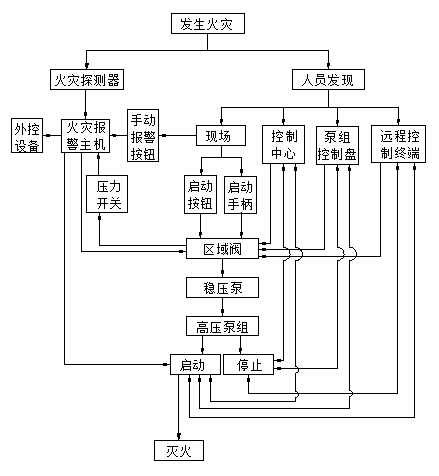 當(dāng)保護(hù)區(qū)內(nèi)發(fā)生火災(zāi)時(shí),火災(zāi)探測(cè)器探測(cè)到火災(zāi),發(fā)出信號(hào)至火災(zāi)報(bào)警控制器?;馂?zāi)報(bào)警控制器根據(jù)火災(zāi)探測(cè)器的地址確認(rèn)發(fā)生火災(zāi)的區(qū)域,發(fā)出聯(lián)動(dòng)啟動(dòng)滅火系統(tǒng)的控制信號(hào),打開(kāi)相應(yīng)的分區(qū)控制閥。分區(qū)控制閥打開(kāi)后管道壓力下降,穩(wěn)壓泵自動(dòng)啟動(dòng)運(yùn)行超過(guò)10秒鐘后因?yàn)閴毫θ赃_(dá)不到1.2MPa,泵組控制盤(pán)自動(dòng)根據(jù)分區(qū)控制閥防區(qū)的大小確定依次啟動(dòng)多臺(tái)高壓主泵(泵組的流量與該防區(qū)的流量略高),使系統(tǒng)管道內(nèi)水迅速達(dá)到工作壓力,并通過(guò)高壓細(xì)水霧噴頭噴射而出,產(chǎn)生細(xì)水霧撲滅火災(zāi)。